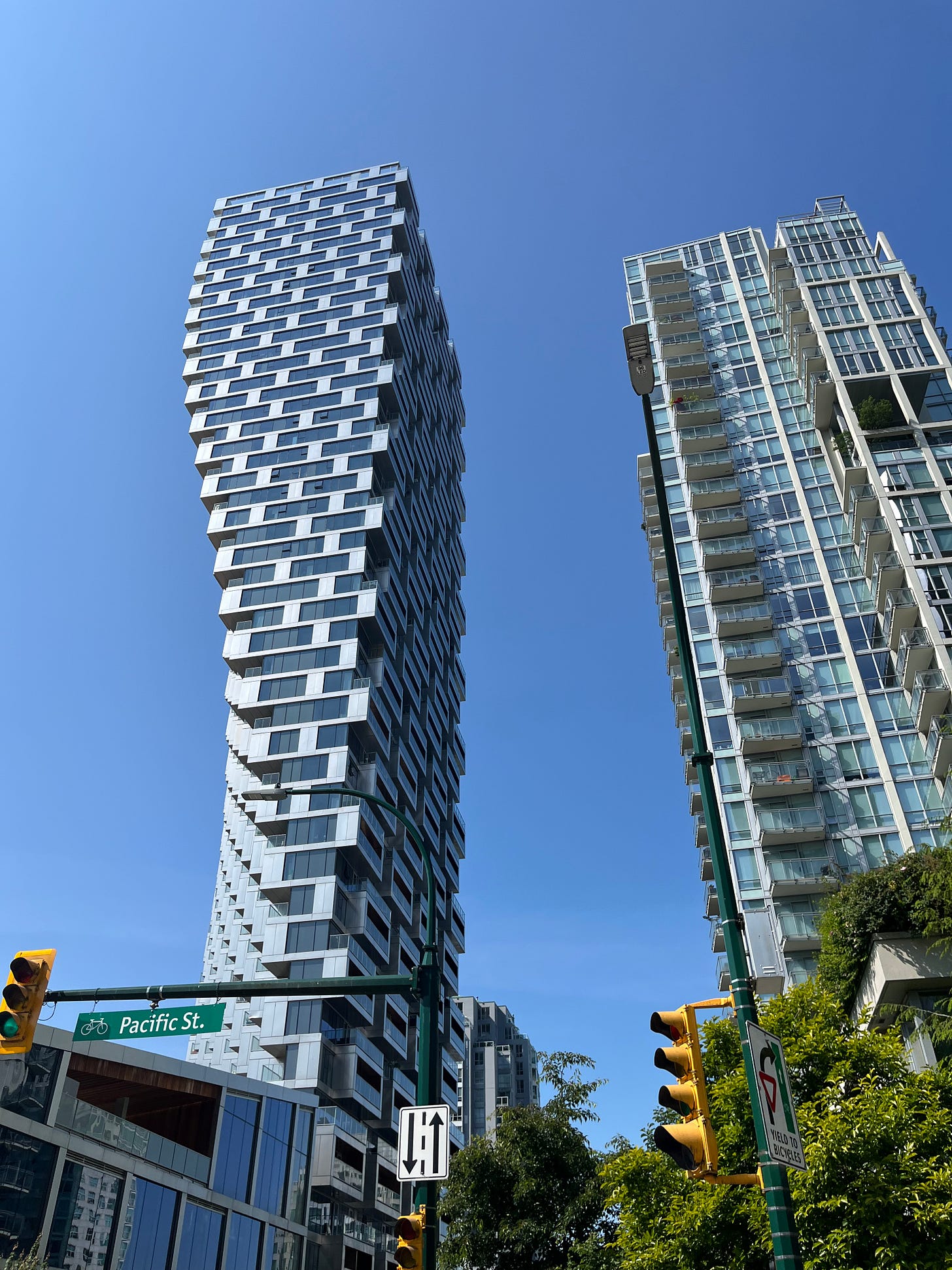 Lasciatemi alle spalle l’Alberta, mi sono poi spostata in un’altra provincia, ancora più a ovest: la British Columbia, dove ho fatto base a Vancouver. A differenza di Calgary, Vancouver è stata una piacevole scoperta. Sarà perché le città di mare (di oceano), volenti o nolenti hanno a mio avviso una marcia in più. Fatto sta che l’impressione che ho avuto è stata completamente opposta rispetto a Calgary: ho trovato Vancouver viva, frizzante e architettonicamente interessante. Tantissimi grattacieli hanno delle forme particolari e sinuose e la guida mi ha spiegato che è perché c’è una regola che riguarda i palazzi residenziali, che impedisce loro di bloccare la vista dull’oceano al palazzo dietro; quindi molte costruzioni, per potersi comunque sviluppare in altezza, sono state progettate con queste strane forme per rispettare questa regola.